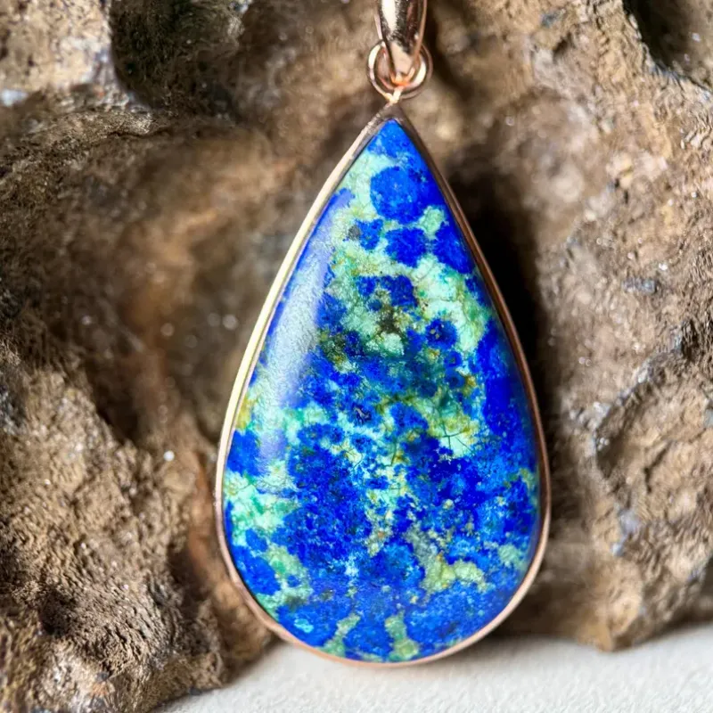 Azurite Chrysocolla Pendant s925 plated gold. This pendant uses silver-gold plating technology. Compared with traditional silver jewelry, it has a more luxurious appearance and longer durability. It will not fade over time and is easier to maintain.
